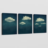 Get ready to drift into calming days with "Floating Clouds." This exquisite three-frame collection features paintings of clouds differently distributed against a deep blue background. The relaxing and minimalist design creates a serene and calming atmosphere. Perfect for any space, this artwork adds a touch of elegance and peace.