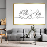 This minimalist line art depicts a group seated together, their outlines flowing effortlessly in one continuous stroke. The simplicity of the black lines on a crisp white background creates a timeless and modern aesthetic.
