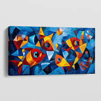 This vibrant piece effortlessly blends bold colors and striking geometric shapes, bringing life and movement to any space. Each fish seems to swim through a sea of blue hues, creating a dynamic contrast that sparks curiosity and wonder. It's perfect for those who appreciate art with a touch of whimsy and modern flair.