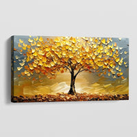 Bring mellowness and reflection to your space with "Gold Tree Sunset." This painting features a majestic golden tree standing alone against a sunset, with its golden leaves drifting through the air. The vibrant colors and serene scenes remind us of the fleeting nature of time and the importance of cherishing each moment.