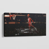 Welcome to the dynamic world of "Make It Happen," where sports greatness meets inspiration. This striking artwork captures a still moment of Michael Jordan in mid-air, executing a legendary dunk. Alongside him is his iconic quote, a reminder of determination and success.