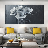 This piece features delicate blooms in monochrome tones, with soft petals that contrast against a textured gray background. Each detail evokes understated beauty, combining subtle light and shadow to create a captivating visual harmony.