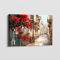 Add a touch of serendipity by adding "Peaceful Vibrance" to your space. This vibrant painting of a Parisian alley radiates nostalgia and romance. It captures the essence of a late afternoon walk on a cold, rainy dusk, evoking the serendipity of finding a lover.