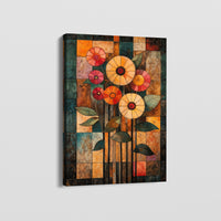 The artwork blends vibrant florals with geometric forms, creating an enchanting juxtaposition of nature and structure. Each shape and hue works together, producing a visually striking dance of color and form. It’s a celebration of balance, where beauty thrives through both organic curves and sharp lines.