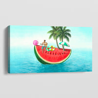 A watermelon floats serenely on the ocean, with a musician playing under the shade of palm trees. Bright beach balls, a striped umbrella, and vivid colors complete the scene, transporting you to a world of endless summer fun.