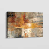 Layers of textured amber, ochre, and muted grays combine to create a dynamic yet soothing composition. Light and shadow interplay across the canvas, evoking nature's fleeting glow.