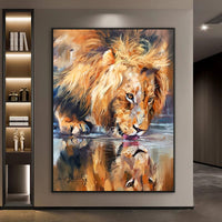 "Lion Heart" portrays the king of the jungle drinking at the riverbank, capturing a lively scene with his reflection. Perfect for stairways, the living room, or a boy's room, this artwork adds a touch of wild energy and majesty to your space. Crafted to resonate and evoke feelings daily, this hand-stretched piece instantly creates a spirited ambiance, making a significant impact on your daily life.