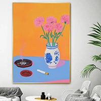 A ceramic vase blooms with soft pink carnations, their lively hue set against a glowing orange canvas. Nearby, a single cigarette and a smoldering ashtray add an unexpected narrative—a fleeting pause, a quiet indulgence.