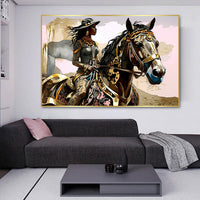 Experience the boundless vitality of "Horseback," an energetic abstract depiction of a tribal woman and her steed galloping through the scorching desert. With its vibrant colors and expressive strokes, this piece captures the essence of movement and freedom. Purchase this masterpiece today and transform your surroundings with its stunning beauty. Don't pass up the opportunity to own this breathtaking artwork and infuse your home with its distinct charm.