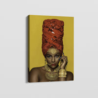 This captivating portrait portrays a woman adorned with a striking red headpiece and shimmering gold accents, set against a luminous yellow backdrop that frames her like a spotlight on a grand stage. Her presence exudes pride in her mixed heritage, embodying the unity and beauty of diverse cultures.