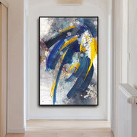 « Blue & Yellow Abstract », une œuvre d'art visuellement captivante qui apporte une explosion d'énergie vibrante à votre buanderie. Ce chef-d'œuvre étiré à la main, avec son jeu dynamique de couleurs, transforme les tâches banales en un délice visuel.