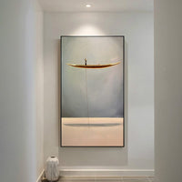 Entrez dans le monde serein de la « Pêche ». Une peinture minimaliste captivante qui célèbre la tranquillité du monde ouvert. C'est un puissant rappel des qualités méditatives de la nature. La beauté sereine peut être trouvée même en l’absence d’eau.