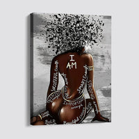 Ontdek de boeiende allure van "Lost in Words". Een modern schilderij dat kracht en zelfbevestiging prachtig weergeeft. Dit opvallende stuk beeldt een naakte vrouw met een donkere huidskleur af, zittend op haar rug, versierd met tatoeages met inspirerende woorden. Elk zorgvuldig geïnkt woord verkondigt, als een krachtige mantra, haar kracht, schoonheid en eigenwaarde. Het kunstwerk toont een vrouw die haar ware zelf omarmt.