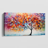 A majestic tree stands tall, its branches bursting with a kaleidoscope of rich reds, warm oranges, and cool blues. Each colorful leaf seems to dance, celebrating the change of seasons in an abstract mosaic of beauty. Perfect for spaces that seek warmth and joy year-round.