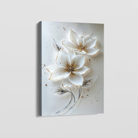 Two magnolia blooms, pure and intricate, unfurl their soft petals against a creamy backdrop sprinkled with golden details. Their lifelike stems and leaves curl gently, creating a sense of quiet movement and natural beauty.