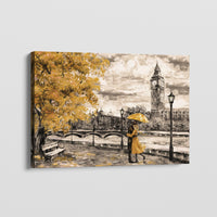 Behold the dazzling fantasy of "Honey Kiss." In the midst of a dusky London evening, two lovers share a sweet embrace under a yellow umbrella. The world around them is muted in charcoal shades, while the honey-colored dress and trees illuminate their tender moment. This artwork captures the warmth and romance of a fleeting kiss, evoking emotions of love and intimacy.