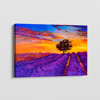 Savor the enchantment of twilight with “Lavenders and Sunset.” This artwork captures the magical moment when lavender fields bask in the glow of a setting sun. Let the vibrant hues of this painting transform your space. The lone tree and vivid sunset bring an ethereal charm that evokes peace and tranquility.