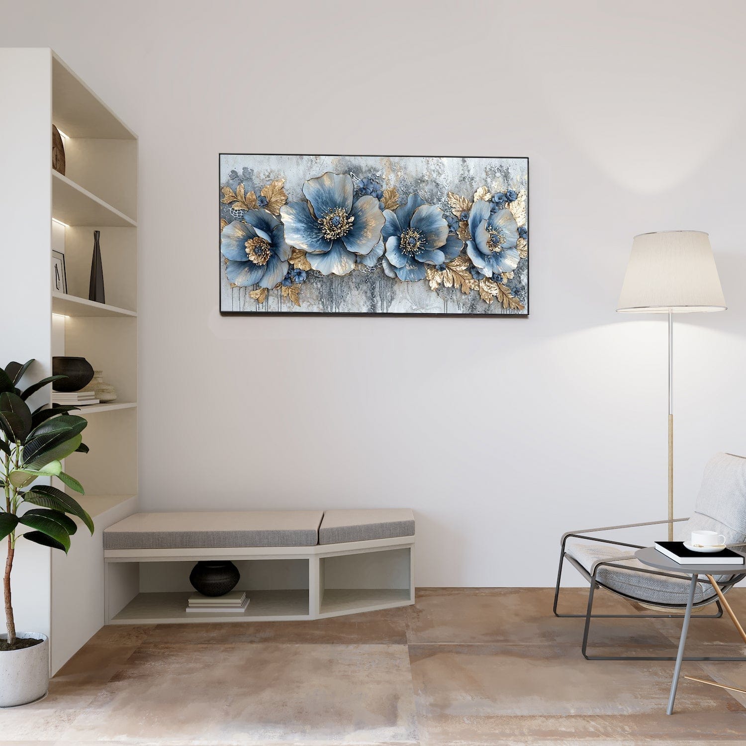 Layers of blue blossoms delicately intertwine with gilded leaves, creating a harmonious contrast against a backdrop that drips with subtle texture. Each petal shimmers, touched with hints of gold, while fine details lend depth to an already enchanting scene. This piece transforms any space into a sanctuary, rich with grace and mystique. Let it inspire whispers of nature’s grandeur and the gentle whispers of a breeze sweeping through a golden garden.