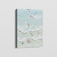 Soft blue hues and gentle waves create a calming embrace, while the lively presence of beachgoers adds warmth and connection. The balance of movement and stillness reflects the peaceful harmony of coastal life.