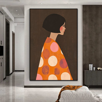 A graceful silhouette, draped in a vibrant orange cloak of soft polka dots, stands against a rich brown backdrop, exuding charm and individuality. The playful mix of retro patterns and earthy tones creates a perfect balance of nostalgia and modern flair.