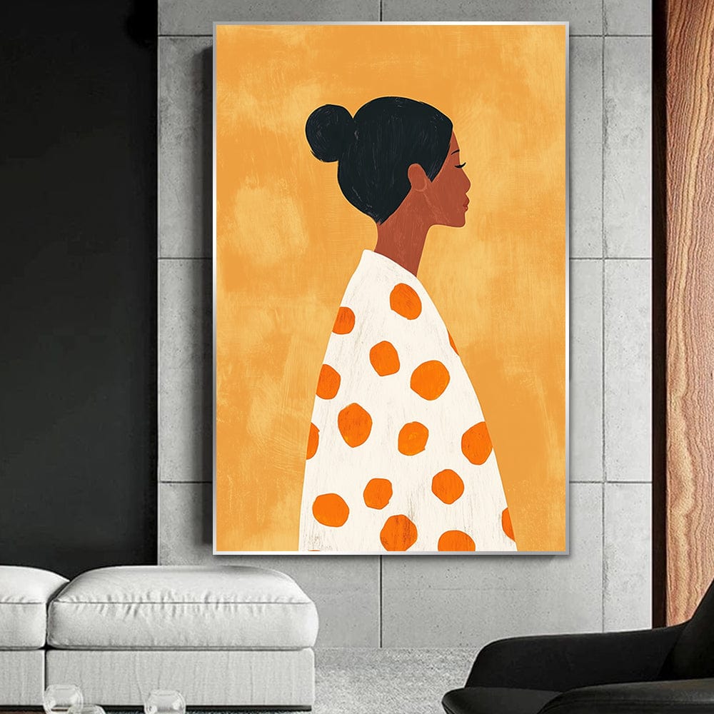 This portrait features a poised woman in profile, her dark hair tied elegantly, draped in a white shawl adorned with bold orange polka dots. The golden backdrop exudes warmth and vibrancy, highlighting her silhouette and understated grace.